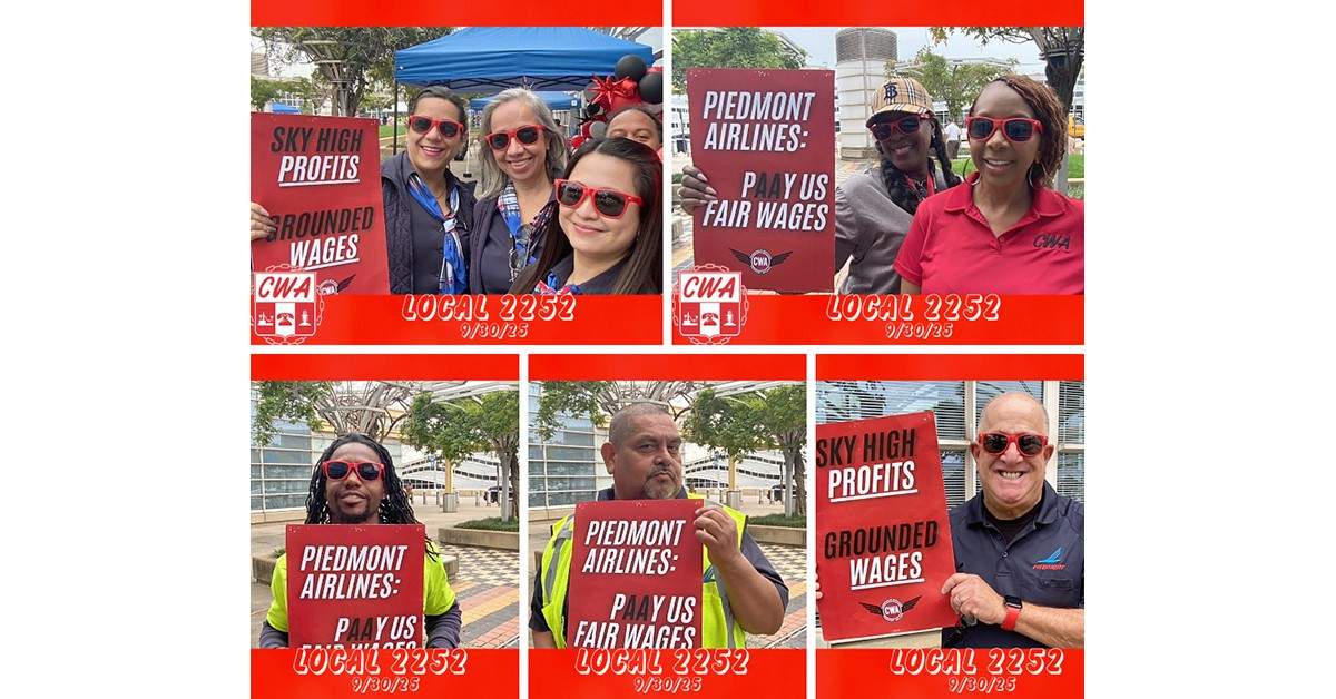 Last week, Piedmont Airlines passenger service and ramp workers seized an opportunity to let the company know it's time to pay Piedmont workers fairly. At an end-of-summer event sponsored by parent company American Airlines, Piedmont workers at CWA Local 2252 held signs demanding the company negotiate a strong contract that secures the wages members deserve. After two years, and with bargaining at a standstill, the bargaining team is preparing for the start of federal mediation later this month.